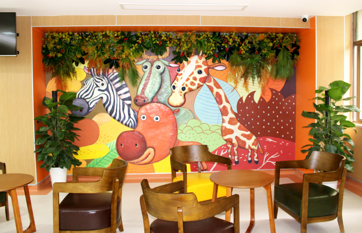 记者发现,该家医院每一个楼层都有一个主题画面。例如二楼被设计成一列长长的健康列车,诊室的门正好充当了列车的“门”,小患者一进一出,就像在月台上上车或下车,无形中化解了病人和家属的焦虑感。在休息区,背景墙上画的是一幅动物园主题,斑马、长颈鹿、河马济济一堂,伸长脖子四处张望,它们似乎正在吃墙角处的绿植。